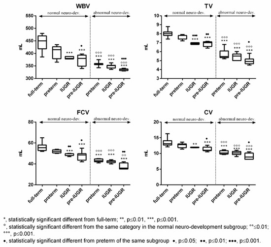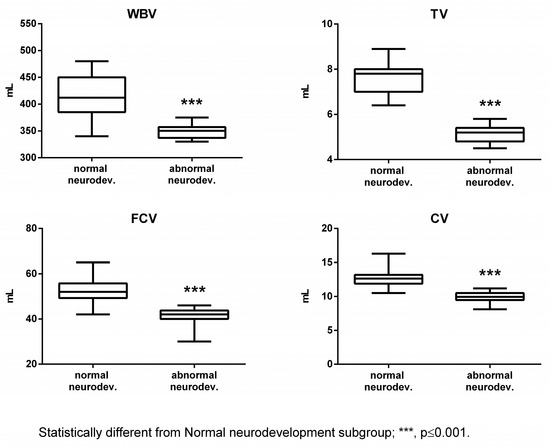 Intrauterine growth restriction (IUGR) and preterm births are associated with a increased risk of impaired cognitive and motor performances or neuro and psychiatric diseases in later life [1,2,3]. Both conditions are also correlated with a reduction in brain volumes, showing the strong relationship between cerebral growth and neuro-disorders [1,2,3]. The early identification of neonates and children at a higher risk of defective neurodevelopment or neurological disability is very important, as they may necessitate prompt interventions to improve their developmental issues [4,5]. Therefore, the Food and Drug Administration, the European Medicine Agency, and the National Institutes of Health promoted research projects towards the identification and validation of new markers, along the development of neuroprotective approaches for individuals at elevated risk [6].