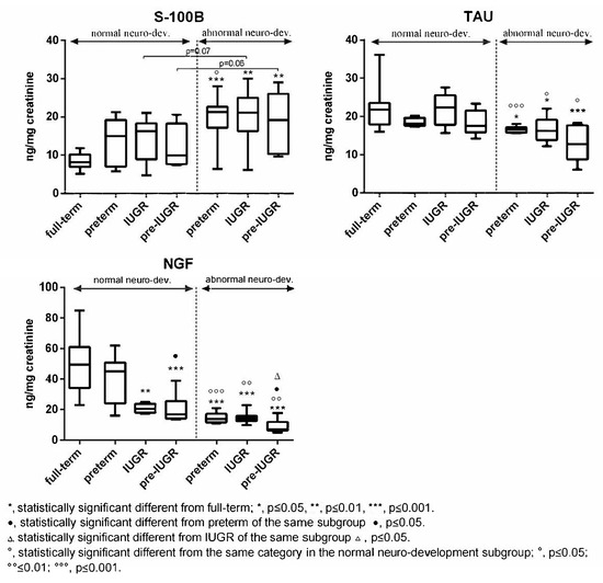 Based on the variability of these two molecules amongst the neonatal categories, the full-term showed the lowest (in the case of S100B) or the highest (in the case of Tau) values, while no differences were observed between the preterm, IUGR and preterm-IUGR in single subgroups. Concerning the urinary NGF and cerebral volumes, and in agreement with previous findings [1,2,3], there were significant differences observed between neonates’ categories, with the preterm-IUGR newborns exhibiting the lowest values in both subgroups.