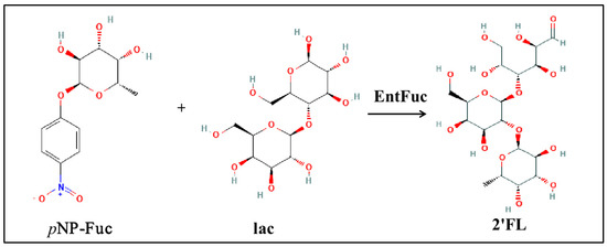 The α-L-fucosidase EntFuc catalyzed the synthesis of 2′−fucosyllactose (2′FL) using 4−Nitrophenyl−α−L−fucopyranoside (pNP−Fuc) and lactose (lac) as substrates.