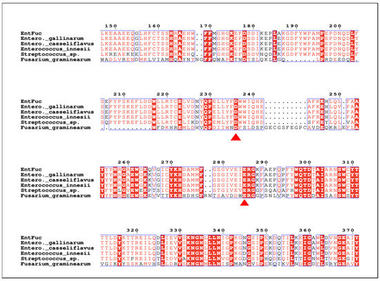 Multiple sequence alignment (MSA) of EntFuc and other α-L-fucssidases. Proteins in the alignments were GH29 α-L-fucosidases from Enterococcus gallinarum (Accession No. WP_01661276.1), Enterococcus casseliflavus (Accession No. WP_275626525.1), Enterococcus innesii (Accession No. WP_252709032.1), and FgFCO1 from Fusarium graminearum (Accession No. AFR68935.1). The putative nucleophile residue and acid/base catalytic residue were labeled with red triangles.