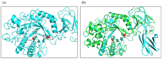 (a) Homology modeling of EntFuc using α-L-fucosidase from Phocaeicola plebeius DSM 17135 (PDB ID:7snk) as a template. The template had 42.70% identity with EntFuc, and the Global Model Quality Estimate (GMQE) of the template was 0.77. The crystal structure of EntFuc with pNP-Fuc docked into the binding pocket are shown. The amino acids Asp236 and Glu285 representing catalytic nucleophiles and acid/base catalysts are shown as sticks, respectively. The distances of the catalytic nucleophile and acid/base catalyst with pNP-Fuc were labeled. (b) The structure comparisons of α-L-fucosidase EntFuc and template.