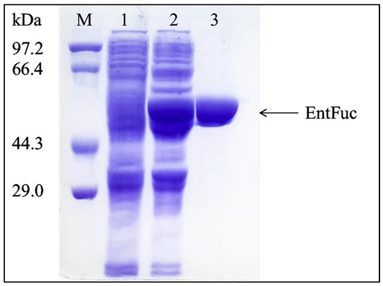 SDS-PAGE of the purified EntFuc. Lane M: standard marker; Lane 1: pET-28a (+); Lane 2: crude α-L-fucosidase EntFuc; Lane 3: EntFuc purified by Ni-affinity chromatography.