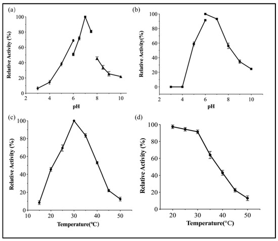 represent pH 3–6, pH 6–8, and pH 8–10, respectively. (b)The pH stability assay. (c) The effects of temperature on the activity of EntFuc. (d) The temperature stability assay.