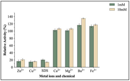 To investigate the influence of various metal ions and SDS on the hydrolytic activity of EntFuc, multiple ions and SDS were added to the reaction mixture. The hydrolytic activity of the enzyme towards pNP-Fuc was inhibited by Zn2+, Cu2+, and SDS, but different concentrations of these metal ions had little influence on the enzyme activity (Figure 6). The addition of Ba2+ and Fe3+ increased the activity. When the concentration of Ba2+ reached 10 mM, the activity of EntFuc was enhanced by 36%, while when the concentration of Ba2+ was 1 mM, the activity of EntFuc was only enhanced by 14%.
