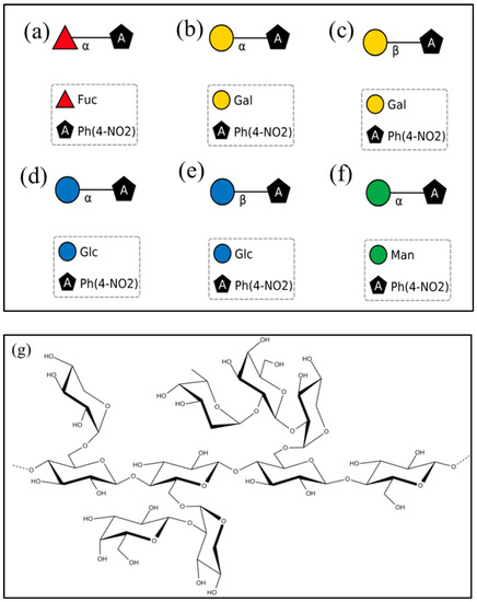 The structure of hydrolysis substrates. (a) pNP-α-L-Fuc, (b) pNP-α-D-Gal, (c) pNP-β-D-Gal, (d) pNP-α-D-Glu, (e) pNP-β-D-Glu, (f) pNP-α-D-mannopyranoside, (g) Xyloglucan.