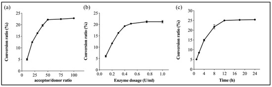 Effects of (a) acceptor/donor ratio, (b) enzyme dosage, and (c) reaction time on the synthesis of 2′FL. Donor/acceptor ratios examined included 1:10, 1:20, 1:30, 1:40, 1:50, 1:75, and 1:100. pNP-Fuc (20 mM) and 0.3 U/mL EntFuc were added to reaction mixture. The reaction time was 12 h. The influence of enzyme dosage (U/mL) ranges from 0.1 U/mL to 1 U/mL. 20 mM pNP-Fuc and 1 M lactose were added to the reaction mixture, and the reaction was performed for 12 h. The effects of reaction times including 1 h, 2 h, 4 h, 8 h, 12 h, 18 h, and 24 h were assayed on the synthesis of 2′FL. 20 mM pNP-Fuc, 1 M lactose, and 0.3 U/mL EntFuc were added to the reaction mixture. The ratio of the amount of the 2′FL (mM) and the added pNP-Fuc (mM) was defined as the conversion ratio (%).