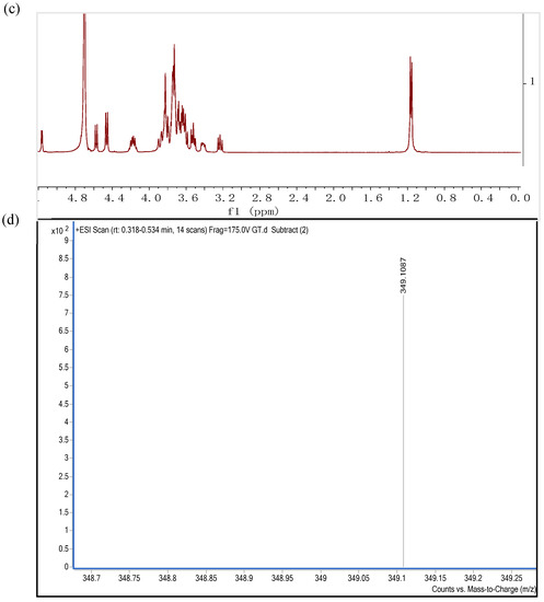 EntFuc catalyzed the synthesis of 2′FL using lactose and pNP-Fuc as substrates. Under optimal temperature and pH, donor/acceptor ratio, enzyme concentration, and reaction time were optimized for transglycosylation. When the donor/acceptor was 1:50 (Figure 8a) and the enzyme dosage was 0.5 U/mL (Figure 8b), the conversion of 2′FL reached 35% after 12 h at pH 7.0 at 30 °C. When the reaction time was over 12 h, the yield of 2′FL was not noticeably increased, indicating that the enzyme was deactivated (Figure 8c). As shown in Figure 9a, HPLC peaks with retention times of 7.21 min and 8.23 min were 2′FL and lactose. The MS spectra (Figure 9b) revealed a peak of [M + NH4]+ ions at a m/z value of 506.2170, which is in accordance with the molecular mass of the standard 2′FL (488.44). 1H NMR spectrometry for the transfucosylation product also suggested the 2′FL was formed catalyzed by EntFuc using pNP-Fuc and lactose as substrates (Figure 9c). To date, most α-L-fucosidases have low efficiency for synthesizing 2′FL. For example, PbFuc [1] from Pedobacter sp. CAU209 was reported to produce 2′FL and 3′FL with a yield of 14.5%. The α-L-fucosidase FgFCO1 [19] from F. graminearun was able to use XyG as a donor and lactose as an acceptor, and the yield of 2′FL was 14%. Mfuc2 [20] isolated from a soil-derived metagenome library could catalyze the formation of 2′FL, and the yield was 6.4% from pNP-fucose. Hence, EntFuc showed excellent potential for the production of 2′FL.