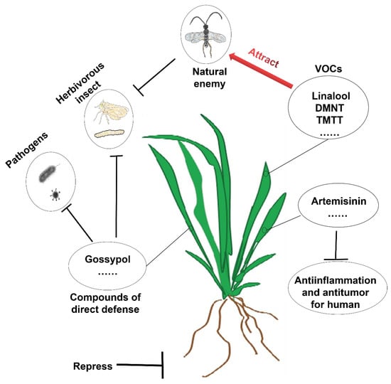 Since the discovery of terpene homologues, a large number of studies have found that the release of DMNT and TMTT from most plants is very low under normal conditions, and that their release increases significantly only when such an increase is induced by biotic or abiotic stress (especially by pests). DMNT and TMTT can attract the natural enemies of insect pests and thereby reduce the damage caused by these pests. For instance, cotton (Gossypium spp.), when attacked by chewing caterpillars or sucking worms, can release DMNT and TMTT and strongly attract natural enemies such as female parasitoids [102]. Terpene homologues commonly attract the natural enemies of insect pests in higher plants. In some cases, this may be due to the combined action of many substances (Figure 2).