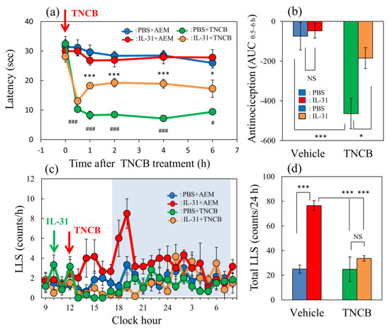Effect of IL-31 on TNCB-applied hot-plate test in BALB/c mice. (a) Effect of repeated pretreatment of IL-31 (50 μg/kg, intraperitoneally, every 12 h for three days) on TNCB (3%, 0.04 mL/each limb, total 0.16 mL/site)-applied hot-plate (45 °C) test. # p < 0.05, ### p < 0.001 compared with the corresponding values in the saline + vehicle-treated group. (b) Total antinociceptive index of IL-31 after 0.5 to 6 h (AUC0.5–6 h). (c) Time-course change of itch-associated scratching behavior (LLS, counts/h) after the application of TNCB (3%, 0.2 mL/dorsal site). The blue line indicates the PBS + AEM-treated group; the red line indicates IL-31 + AEM-treated group; the green line indicates PBS + TNCB-treated group; the yellow line indicates IL-31 + TNCB-treated group. The blue column indicates the PBS + AEM-treated group; the red column indicates the IL-31 + AEM-treated group; the green column indicates the PBS + TNCB-treated group; the yellow column indicates the IL-31 + TNCB-treated group. (a,b) * p < 0.05, *** p < 0.001 compared with the corresponding values in the PBS + TNCB-treated group. The lateral axis indicates the clock hour, and the shaded area represents nighttime (dark phase, 7:00 pm to 7:00 am). (d) Total LLS counts for 24 h. The blue column indicates the IL-31 + AEM-treated group; the red column indicates the IL-31 + TNCB-treated group; the green column indicates the PBS + TNCB-treated group; the yellow column indicates the IL-31 + TNCB-treated group. The red arrow indicates the AEM or TNCB application point. The blue arrow indicates the IL-31 (1 mg/kg, intraperitoneally) administration point. Each value represents the mean ± standard error (S.E.) from 6 mice (total 36 mice). *** p < 0.001 compared with the vehicle (PBS) + TNCB-treated group. Three-way ANOVA: group × treatment × time: F (5, 120) = 2.760, p = 0.0214, (a); group × treatment × time: F (23, 480) = 1.230, p = 0.2124, (c). Two-way ANOVA: group × treatment: F (1, 20) = 4.303, p = 0.0512, group: F (1, 20) = 18.68, p = 0.0003, treatment: F (1, 20) = 6.296, p = 0.0208, (b); group × treatment: F (1, 20) = 13.95, p = 0.0013, group: F (1, 20) = 14.16, p = 0.0012, treatment: F (1, 20) = 27.89, p < 0.0001, (d).