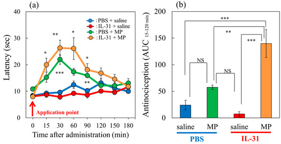 In a conventional hot-plate test (51 °C), morphine (MP, 3 mg/kg, subcutaneously) significantly increased the latency (Figure 2a, green line) and total antinociceptive index 15–120 min after administration (AUC15–120 min) (Figure 2b, green column) compared with the saline-treated group (Figure 2b, blue column). Morphine (3 mg/kg, subcutaneously) significantly increased the latency (Figure 2a, green line) and total antinociceptive index 15–120 min after administration (AUC15–120 min) (Figure 2b, green column) compared with the saline-treated group (Figure 2b, blue column) in a conventional hot-plate test (51 °C). In contrast, repeated pretreatment with IL-31 decreased latency (Figure 2a, red line) and the total antinociceptive index after 15 to 120 min (AUC15–120 min) (Figure 2b, red column); however, no significant difference was observed. Moreover, the effect of the combination of morphine and repeated pretreatment with IL-31 significantly enhanced morphine-induced increasing latency (Figure 2a, yellow line) and the total antinociceptive index (AUC15–120 min) (Figure 2b, yellow column).
