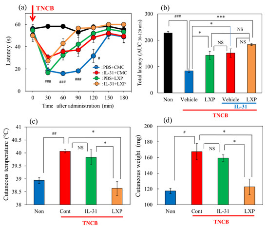 Therefore, we measured the cutaneous weight and temperature for 24 h after TNCB application in subsequent experiments. Then, IL-31 did not change the cutaneous temperature or swelling. In contrast, loxoprofen (LXP) significantly decreased TNCB-induced fever and swelling (Figure 3c,d).