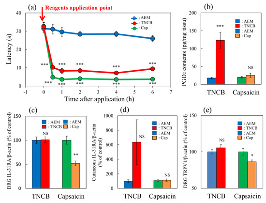 Comparative effects of TNCB or capsaicin on latency in modified hot-plate test and several pain-related parameters in BALB/c mice. (a) Time-course changes of latency caused by topical application of TNCB (3%) or capsaicin (Cap, 1%) in modified hot-plate (45 °C) test. The red arrow indicates the vehicle (acetone-ethanol mixed liquor, AEM, 0.2 mL/site) or TNCB or capsaicin application point. The values represent the means ± standard error (S.E.) from 6 mice. *** p < 0.001 compared with the respective value of the AEM-treated group. (b) Effects of TNCB and capsaicin on cutaneous PGD2 contents 1 h after application. (c) Effects of TNCB or capsaicin on DRG neuronal IL-31RA mRNA expression 6 h after application. (d) Effects of TNCB or capsaicin on cutaneous IL-31 mRNA expression 1 h after application. € Effects of TNCB or capsaicin on DRG neuronal TRPV1 mRNA expression 6 h after application. The values represent the means ± standard error (S.E.) from 6 mice (total 42 mice). (a–d) NS, not significant, * p < 0.05, ** p < 0.01, *** p < 0.001 compared with the respective value of the AEM-treated group. Two-way ANOVA: time × group: F (10, 90) = 14.22, p < 0.0001, time: F (5, 90) = 74.75, p < 0.0001, group: F (2, 90) = 307.4, p < 0.0001, (a); group × treatment: F (1, 20) = 18.51, p = 0.0003, group: F (1, 20) = 22.51, p = 0.0001, treatment: F (1, 20) = 16.9, p = 0.0005, (b); group × treatment: F (1, 20) = 10.65, p = 0.0039, group: F (1, 20) = 9.817, p = 0.0052, treatment: F (1, 20) = 10.65, p = 0.0039, (c); group × treatment: F (1, 20) = 3.016, p = 0.0978, group: F (1, 20) = 3.014, p = 0.0979, treatment: F (1, 20) = 3.016, p = 0.0978, (d); group × treatment: F (1, 20) = 6.93, p = 0.0160, group: F (1, 20) = 1.273, p = 0.2725, treatment: F (1, 20) = 6.932, p = 0.0159, (e).