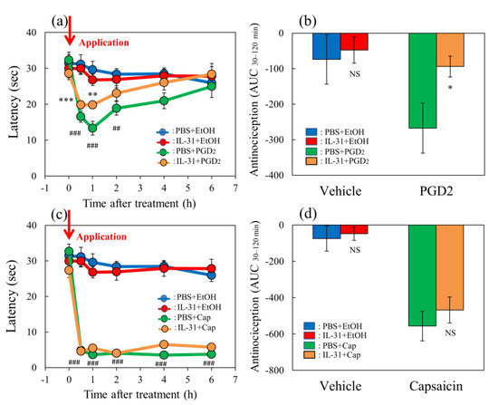 Effects of IL-31 on PGD2- or capsaicin-applied hot-plate test in BALB/c mice. (a) Effect of IL-31 on PGD2-induced decreasing latency on hot–plate (45 °C) test. ** p < 0.01, *** p < 0.001 compared with the corresponding values in the vehicle (ethanol, EtOH, 0.2 mL/site)-treated group; ## p < 0.01, ### p < 0.001 compared with the corresponding values in the vehicle-treated group. (b) Total antinociceptive index from 30 to 120 min (AUC30–120 min) after PGD2 application. NS, not significant, * p < 0.05 compared with the corresponding values in the vehicle-treated group. (c) Effect of IL-31 on capsaicin (Cap)-induced decreasing latency on modified hot-plate (45 °C) test. ### p < 0.001 compared with the corresponding values in the vehicle-treated group. (d) After capsaicin application, the total antinociceptive index changes from 30 to 120 min (AUC30–120 min). The blue line indicates the vehicle (phosphate-buffered saline, PBS, intraperitoneal, every 12 h for 3 days) + EtOH-group; the red line indicates the IL-31-pretreated (50 μg/kg, intraperitoneal, every 12 h for 3 days) + EtOH-treated group; the green line indicates PBS + PGD2 (0.1%, 0.04 mL/each limb)- or capsaicin (3%, 0.04 mL/each limb)-treated group; the yellow line indicates IL-31 + PGD2- or capsaicin-treated group. The red arrow indicates the vehicle (ethanol, EtOH)- or PGD2 or capsaicin application point. Values represent the mean ± S.E. from 6 mice (total of 48 mice). NS, not significant, compared with the respective values of the vehicle-treated group. Three-way ANOVA: group × treatment × time: F (5, 120) = 0.885, p = 0.4934, group × treatment: F (1, 120) = 5.631, p = 0.0192, group: F (1, 120) = 47.782, p < 0.0001, treatment: F (1, 120) = 1.591, p = 0.2096, time: F (5, 120) = 7.123, p < 0.0001, (a); group × treatment × time: F (5, 126) = 0.824, p = 0.5347, group: F (1, 126) = 903.432, p < 0.0001, treatment: F (1, 126) = 0.315, p = 0.5759, time: F (5, 126) = 50.026, p < 0.0001, (c). Two-way ANOVA: group × treatment: F (1, 20) = 1.79, p = 0.1959, group: F (1, 20) = 3.317, p = 0.0835, treatment: F (1, 20) = 4.791, p = 0.0406, (b); group × treatment: F (1, 21) = 0.2122, p = 0.6498, group: F (1, 21) = 44.57, p < 0.0001, treatment: F (1, 21) = 0.727, p = 0.4035, (d).