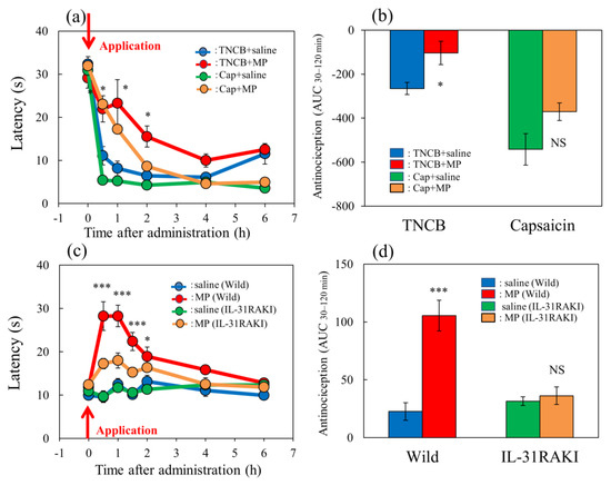 Capsaicin significantly decreased latency from 0.5 to 6 h after application (Figure 5c, green line). After repeated pretreatment with IL-31 in the capsaicin-applied group, the capsaicin-induced decreased latency did not change (Figure 5c, yellow line). The total antinociceptive index of the vehicle (PBS)-applied to the group and the IL-31 pretreatment group were not significantly different (Figure 5d, left side). Therefore, we investigated the effects of several analgesics on TNCB- or capsaicin-induced pain in wild-type and IL-31RAKI mice.