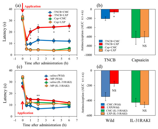 The latency rapidly decreased 30 min after TNCB or capsaicin was applied in the hot-plate (45 °C) test in BALB/c mice (Figure 7a, blue and green line). Loxoprofen (LXP), which is a reversible cyclooxygenase inhibitor, (15 mg/kg, oral), significantly delayed latency 0.5 to 6 h after loxoprofen treatment on the TNCB (3%, 0.04 mL/each limb)-applied hot-plate test, compared with the respective value of the vehicle (carboxymethyl cellulose sodium, CMC, 10 mL/kg, oral)-treated group (Figure 7a, red lines).