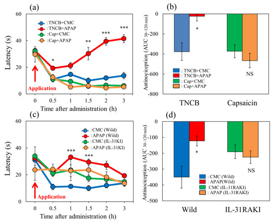 In wild-type (C57BL/6) and IL-31RAKI (C57BL/6 genetic background) mice, the latency rapidly decreased 30 min after TNCB application on the modified hot-plate (35 °C) test (Figure 8c, blue and green lines). Acetaminophen (APAP, 300 mg/kg, oral) delayed the latency time and increased antinociception compared with the CMC-treated group (Figure 8c, red line). The total antinociceptive index of acetaminophen after 30–120 min (AUC30–120 min) was significantly increased compared with that of the CMC-treated group (Figure 8d, left side). However, acetaminophen did not affect the TNCB-applied hot-plate test in IL-31RAKI mice (Figure 8d, yellow line and column, right side). These results were similar to those of capsaicin-induced pain on the modified hot-plate test (Figure 8b).