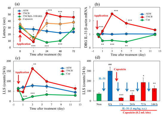 In the group where the vehicle (acetone-ethanol mixed liquor, AEM, 0.04 mL/each limb) was applied to the limbs of the mice, latency was not changed during the experimental period on the modified hot-plate test (45 °C) (Figure 9a, blue line). Both TNCB (3%, 0.04 mL/each limb) and capsaicin (1%, 0.04/each limb) induced a decreased latency after their application until 6 h. However, their effect differed 24 h after their topical application. The decreased latency was reversed in the TNCB group after 24 h and showed pain torpor until 72 h, whereas that in the capsaicin group continued to decrease until 72 h after application (Figure 9a, red and green lines). In IL-31RAKI mice, TNCB showed decreased latency after application until 6 h (Figure 5a, yellow line) and then returned to basal levels after 24 h (Figure 9a, yellow line). The pain torpor was not observed in IL-31RAKI mice. In the TNCB group, IL-31RA expression in the DRG increased within 1 to 6 days after application, whereas that in the capsaicin group continued decreasing until 6 days after application (Figure 9b, red and green lines). TNCB showed a significant decrease in LLS counts from immediately after application until 6 h (Figure 9c), which then increased 3 days after administration, and gradually decreased to basal levels 12 days after administration (Figure 9c, red line). The capsaicin group also showed significantly decreased LLS counts immediately after its application until 6 days after (Figure 9c, green line), which did not recover during the experimental period. We measured IL-31-induced (1 mg/kg, intravenously) LLS counts for IL-31 reactivity. Before capsaicin application, LLS counts of the vehicle (PBS) and IL-31 administration groups were 70.3 ± 11.3 and 299.1 ± 39.7 counts/24 h, respectively (Figure 9, green and blue columns). The IL-31-induced LLS counts at 1, 24, 72, and 144 h (6 days) after capsaicin application were 30.1 ± 4.3, 56.8 ± 23.1, 184.6 ± 2.2, and 124.2 ± 26.2 counts/24 h, respectively (Figure 9d, red columns), which were significantly decreased compared with those before capsaicin application (Figure 9d, red columns).