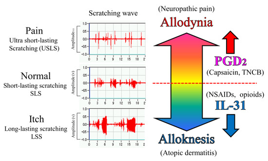 These findings suggest that IL-31 may cause alloknesis; it alters the non-selective irritant stimulation into itch stimulation in mouse skin [47,48]. Therefore, it is possible that pain and itch are transmitted on the same nerve fibers, and a sensation is perceived as pain or itch depending on the operation of IL-31. However, PGD2 decreased LLS counts induced by the cutaneous injection of pruritogens or algogens in IL-31-induced itchy skin. These results indicate that PGD2 improves IL-31-induced alloknesis and it alters the non-selective irritant stimulation into pain stimulation in mouse skin [43]. Collectively, these data suggest that the sensation of pain and itch may be regulated by PGD2 (allodynia-inducer) [49] and/or IL-31 (alloknesis-inducer) [38], through their functional antagonism (Figure 10).