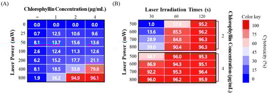 Phototoxicity of chlorophyllin with laser irradiation on HeLa cell. (A) Evaluation of cytotoxicity on various chlorophyllin concentrations and laser intensities for 60 s; (B) determination of the optimal condition of PDT on cell death.