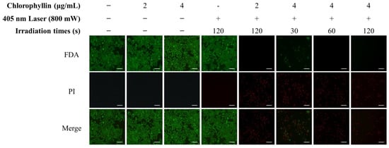 Phototoxicity of chlorophyllin-assisted PDT (405 nm, 800 mW/cm2) by live/dead assay. (green, live cells; red, dead cells). Scale bar, 200 μm.