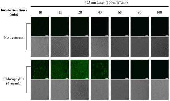 Chlorophyllin, as a molecular analog of chlorophyll, is a semi-synthetic mixture of sodium copper complex []. It is hydrophilic in that the phytol tail is removed by the substitution of metal ion at the center of the porphyrin ring, whereas chlorophyll is hydrophobic []. It is quite advantageous to apply it in in vivo studies and show its clinical utility. Moreover, chlorophyllin is non-toxic, is quickly cleared from the body, and is more stable to the light and acid compared to chlorophyll [,]. As numerous studies have shown, chlorophyllin has several biological activities, including antioxidant [], anti-proliferation [], antibacterial [], and anti-inflammatory properties []. In particular, the chlorophyllin has the main absorption peak at 405 nm, and can thus be applied as a photosensitizer (Figure S1). Thus, applications of a photodynamic reaction with chlorophyllin and a 405-nm laser to induce cell death were investigated.