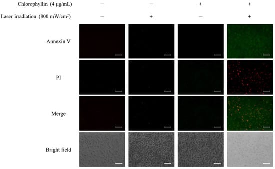 Chlorophyllin-assisted PDT on apoptosis with Annexin V-FITC detection kit by fluorescence microscopy. Annexin V/PI staining revealed that these cells were at an apoptosis stage (green and red fluorescence indicated Annexin V and PI, respectively). Scale bar, 100 μm.