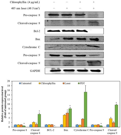 In order to determine the induction of apoptosis in the HeLa cells with photodynamic reaction, cell membrane phosphatidylserine content was evaluated by monitoring Annexin V/PI double staining. As shown in Figure 6, chlorophyllin-assisted PDT alone increased fluorescence intensities of annexin V and PI compared to other groups. Western blot in Figure 7 showed that chlorophyllin-assisted PDT downregulates protein expression levels of B-cell lymphoma-2 (BCL-2), which is an anti-apoptotic protein. On the other hand, chlorophyllin-assisted PDT upregulated protein expression levels of BCL-2 associated X protein (Bax) and cytochrome C, which are apoptotic-related proteins. Subsequently, we determined whether photodynamic reaction modulates the protein expression of caspase cascades. The results show that chlorophyllin-assisted PDT increased the cleaved caspase 8 and caspase 9, which are apoptosis-associated proteins. Therefore, these results indicate that chlorophyllin-assisted PDT induces caspase-dependent programmed cancer death.