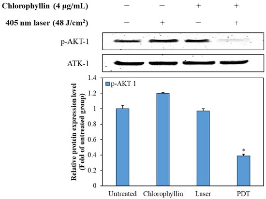 Effect of the chlorophyllin-assisted PDT on AKT-1 pathway in HeLa cells. The values are expressed as the means ± standard deviation of triplicate experiments. * p < 0.05 indicates significant differences compared with the untreated group.