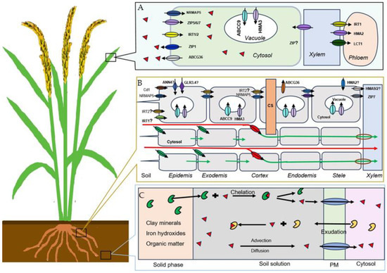After being taken up by the roots and loaded into the root xylem, Cd is transported to the above-ground plant parts through the xylem sap flow, which is primarily driven by plant transpiration and the water potential gradient between the soil and atmosphere. Numerous studies have confirmed this mechanism. Spraying a transpiration inhibitor, such as abscisic acid (ABA), on leaves, dramatically reduced Cd accumulation in lndian Mustard leaves [55]. Using isotopic analysis, it was found that in wheat roots, higher transpiration rates were positively related to higher Cd accumulation [56]. Through a determination of Cd levels among 69 rice genotypes, it was found that Cd levels in the xylem sap were strongly correlated to the Cd concentrations in shoots and grains [57].