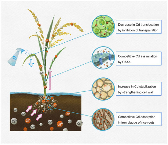 However, to date, the antagonistic mechanism between Ca and Cd in plants, especially for rice, has not been thoroughly understood. According to the mode of Ca and Cd, their uptake and translocation may be joined in the following aspects, including exchange absorption on root, plant cell-wall composition, co-transporter gene expression, and transpiration inhibition. Thus, this review systematically elaborates on the migration process of Cd in the soil–plant system, and then discusses the possible mechanisms of Ca in inhibiting Cd translocation in rice plants. The aim of the paper was to provide theoretical and practical support for the utilization of Ca materials in preventing Cd accumulation in rice and improving food safety.