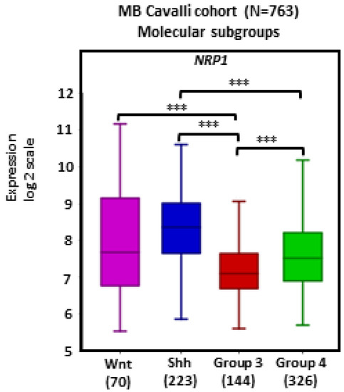NRP1 gene expression in different molecular subgroups of human MB. Tumors from the dataset, as described by Cavalli et al. [24], were analyzed with the R2 Genomics Analysis and Visualization Platform (http://r2.amc.nl). Results are presented in boxplot format as log2-transformed signal intensity. Bars show data for Group 3 (n = 144), Group 4 (n = 326), SHH (n = 223), and WNT (n = 70) MB; *** p < 0.001.