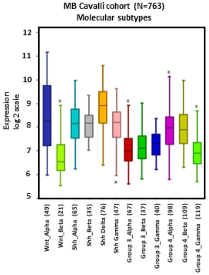 The database Tumor Medulloblastoma-Pfister-167 [5] was downloaded from R2: Genomics Analysis and Visualization Platform (https://hgserver1.amc.nl/cgi-bin/r2/main.cgi (accessed on 12 July 2023)). Data were acquired, normalized, and log2 transformed. The number of samples analyzed per molecular subgroup was WNT, n = 16, SHH, n = 46, Group 3, n = 41, and Group 4, n = 64 MB tumors. The “ggplot2”, “ggsignif”, and “tidyverse” packages were used for analysis and graph plotting. The “PMCMRplus” package was used for statistical analysis. The packages were used in R version 4.3.0.