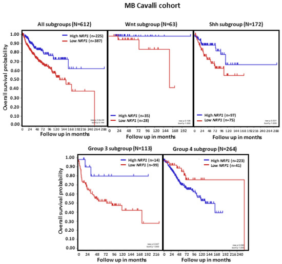 In summary, the present study is the first to report a subgroup-specific decline in OS associated with a reduction in NRP1 expression in MB tumors. This finding highlights the importance of identifying differences among MB groups when characterizing biomarkers and therapeutic targets. Further experiments should aim to clarify whether NRP1 has differential effects on MB growth depending on molecular subtype.