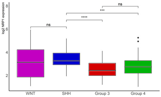 Analysis of data in another, smaller MB dataset, namely the Tumor Medulloblastoma–Pfister (n = 67), originally described in reference [5], confirmed significantly lower NRP1 transcription levels in Group 3 (n = 41, p < 0.001) and Group 4 (n = 64, p < 0.0001) tumors compared with SHH tumors (n = 46, Figure 4).