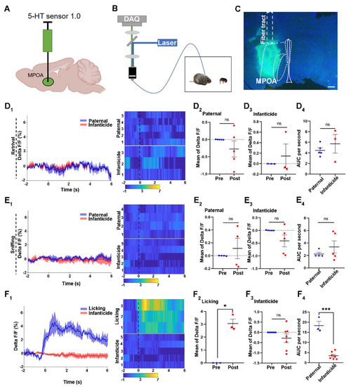 The 5-HT release upon licking or infanticidal behavior of virgin adult male mandarin voles. (A,B) The fiber photometry system used for recording the 5-HT signal from the MPOA. Schematic of behaviors assay (B); injection strategy (A); (C) representative injection site and fiber implantation for fiber photometry recording. Scale bar, 200 μm; (D1,E1,F1) Average 5-HT signal changes during retrieving: (D1) sniffing, (E1) infanticide, and (F1) licking. Meanwhile, the heat maps also represented each behavior. (D1) voles showing paternal care = 5, voles showing infanticide = 3; (E1) voles showing paternal care = 4, voles showing infanticide = 5; (F1) voles showing licking = 3, voles showing infanticide = 5. (D2,D3,E2,E3,F2,F3) Quantification of change in 5-HT sensor fluorescence signals before and after pup retrieval (D2,D3); sniffing (E2,E3); licking (F2); infanticide (F3). Paired sample t-test. (D2) n = 5 voles, t (4) = 1.16, p = 0.311 > 0.05; (D3) n = 3 voles, t (2) = −0.638, p = 0.588 > 0.05; (E2) n = 4 voles, t (3) = −0.721, p = 0.523 > 0.05; (E3) n = 5 voles, t (4) = 1.775, p = 0.151 > 0.05; (F2), n = 3 voles, t (2) = −8.732, p = 0.013 < 0.05; (F3) n = 7 voles, t (6) = 1.324, p = 0.234 > 0.05. (D4,E4,F4) Comparison of area under the curve (AUC) per second of retrieval: (D4) sniffing; (E4) licking; and (F4) infanticide. Independent sample t-test: (D4) t (6) = 0.355, p = 0.735 > 0.05; (E4) t (7) = −1.004, p = 0.349 > 0.05; (F4) t (8) = 9.043, p < 0.001. Changes in the fluorescence signal of the control virus of the 5-HT 1.0 sensor during different behaviors are shown in Supplement Figure S2. The data are shown with the mean ± SEM. ns, not significant; * p < 0.05; *** p < 0.001.