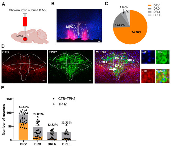 Verification of 5-HT neuron projections from the ventral part of the DR region to the MPOA. (A) Injection strategy of CTB; (B) the representative distribution of CTB in MPOA; (C) the percentage of CTB + TPH2 cell numbers in different subregions of the DR in the total number of CTB + TPH2 cells in the DR. DRD: dorsal part of DR; DRV: ventral part of DR; DRLr: right lateral part of DR; DRLl: left lateral part of DR. (D) The representative images of the merge of 5-HT neurons and CTB in the DR; (E) the number of CTB + TPH2 cells and TPH2-positive cells in each subregion of DR and the percentages of CTB + TPH2 cells in TPH2 cells of each subregion. The data are shown as mean ± SEM. Scale bar, 200 μm.