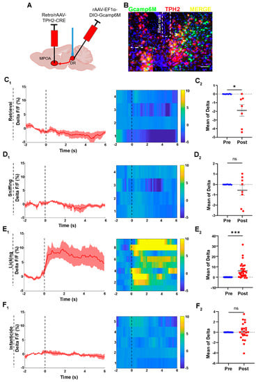 Activities of 5-HTergic neurons in the DR during the licking behavior of voles. (A) The injection strategy for the calcium imaging virus; (B) the representative photomicrograph of calcium virus expression in the DR; Scale bar, 200 μm. (C) The activities of neuron during retrieval behaviors of paternal and infanticidal voles; (C1) the curve of delta F/F, heat map; n = 4 voles. (C2) The mean of delta F/F, paired sample t-test, n = 7, t (6) = 2.829, p = 0.030 < 0.05; (D) the activities of neurons during sniffing behaviors of paternal and infanticidal voles; (D1) the curve of delta F/F, heat map; n = 4 voles; (D2) the mean of delta F/F, paired sample t-test, n = 8, t (7) = 1.156, p = 0.286 > 0.05; (E) the activities of neurons during licking behaviors of paternal voles; (E1) the curve of delta F/F, heat map; n = 9 voles; (E2) the mean of delta F/F, paired sample t-test, n = 35, t (34) = −5.263, p < 0.001; (F) the activities of neurons during infanticidal behaviors of infanticidal voles; (F1) the curve of delta F/F, heat map. n = 5 voles; (F2) the mean of delta F/F, paired sample t-test, n = 22, t (21) = −0.007, p = 0.995 > 0.05. Changes in the fluorescence signal of the control virus of GCaMP6m during different behaviors are displayed in Supplement Figure S3. The data are showed as mean ± SEM; ns, not significant; * p < 0.05; *** p < 0.001.