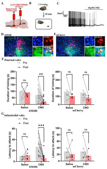 Chemogenetic inhibition of the 5-HT neural projections decreased the licking duration and shortened the onset latency of infanticide of voles. (A) The injection strategy of the hM4Di and mCherry virus; (B) the protocol of behaviors test; (C) the representative trace from a Gi-DREADD neuron; (D,E) the expression of the hM4Di and mCherry virus in the DR region; (F) the results of hM4Di-expressing and mCherry-expressing paternal voles, before and after injecting CNO or saline. Paired sample t-test. hM4Di voles, t saline (5) = 0.31, p = 0.769 > 0.05; t CNO (14) = 3.14, p = 0.007 < 0.01. mCherry voles, t saline (4) = 1.128, p = 0.322 > 0.05; t CNO (5) = 1.842, p = 0.125 > 0.05. (G) The results of hM4Di-expressing and mCherry-expressing infanticidal voles, before and after injecting CNO or saline. Paired sample t-test. hM4Di voles, t saline (7) = −0.177, p = 0.864 > 0.05; t CNO (16) = 4.394, p < 0.001. mCherry voles, t saline (5) = 0.548, p = 0.607 > 0.05; t CNO (5) = 0.951, p = 0.385 > 0.05. The effects of chemogenetic inhibition of DR to MPOA 5-HTergic projection on other behaviors are shown in Supplement Figure S4. The are data shown as mean ± SEM. Scale bar, 200 μm; ns, not significant; **, p < 0.01; ***, p < 0.001.