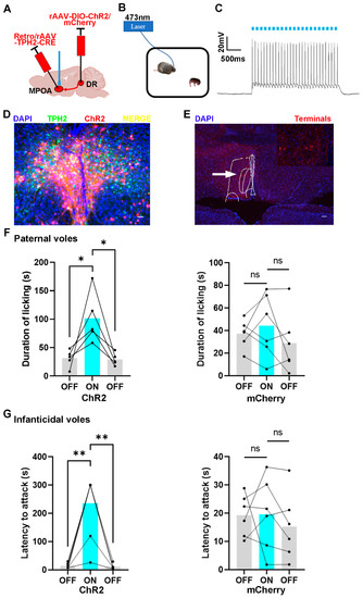 The effects of optogenetic activation of DR to MPOA 5-HTergic projections on the licking duration and the onset latency of infanticide of voles. (A) The injection strategy of the ChR2 and mCherry virus; (B) the protocol of the behavior test; (C) the representative trace from a ChR2-expressing neuron; (D,E) the expression of the ChR2 virus in the MPOA and DR regions. (D) scale bar 200 μm; (E) scale bar 400 μm; (F) the results of ChR2-expressing and mCherry-expressing paternal voles with light on or light off. Paired sample t-test: ChR2 voles, toff-on (4) = −2.792, p = 0.049 < 0.05; ton-off (4) = 3.68, p = 0.021 < 0.05; mCherry voles, toff-on (5) = −0.756, p = 0.484 > 0.05; ton-off (5) = −1.446, p = 0.208 > 0.05. (G) The results of ChR2-expressing and mCherry-expressing infanticidal voles with light on or light off. Paired sample t-test: ChR2 voles, toff-on (6) = −5.315, p = 0.002 < 0.01; ton-off (6) = 5.362, p = 0.002 < 0.01; mCherry voles, toff-on (5) = 0.0.045, p = 0.996 > 0.05; ton-off (5) = −1.639, p = 0.162 > 0.05. The expression of the control virus and the effects of optogenetic activation of DR to MPOA 5-HTergic projection on other behaviors are shown in Supplement Figure S5. The injection sites and the diffusion of the virus in the ventral part of the DR are shown in Supplement Figure S6. The data are shown as mean ± SEM. ns, not significant; *, p < 0.05; **, p < 0.01.