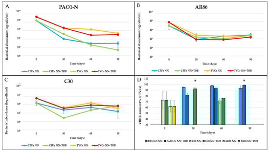 The in vitro biofilms of P. aeruginosa PAO1-N, C30, and AR86 were developed for 48 h in lysogenic broth (LB) and then maintained for 90 days in non-nutrient (NN) broth, (i.e., M9 minimal medium lacking carbon sources), with/without tobramycin. Each strain exhibited a peculiar pattern of adaptation to the stress conditions, with different trends in VBNC subpopulation development (Figure 1).