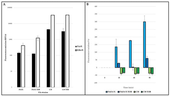 Upon exposure to the dye, the fluorescence naturally emitted by P. aeruginosa increased in both strains (Figure 2A), indicating the entrance of EtBr into the cells. In P. aeruginosa PAO1-N, the fluorescence gradually increased, particularly in the drug-free medium, during 1.5 h of monitoring (Figure 2B, blue columns), while in P. aeruginosa C30, the fluorescence decreased by 30–40% compared to the starting value (Figure 2B, green columns), irrespective of the presence of tobramycin, after only 30 min of exposure. The lower fluorescence of P. aeruginosa PAO1-N when the strain was exposed to tobramycin is indicative of drug-induced efflux activity. By contrast, the similar rates of fluorescence decrease in both tobramycin-exposed and -unexposed P. aeruginosa C30 cultures suggests greater basal efflux activity. These results were supported by the gene expression analyses of the mexY gene, encoding for the inner protein of the MexXY-OprM system, in both P. aeruginosa PAO1-N and C30 (Figure 3).