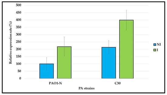 mexY gene expression in P. aeruginosa. The mexY gene expression was compared in P. aeruginosa (PA) PAO1-N and C30, grown in absence/ presence of 1/4xMIC tobramycin, i.e., not induced (NI)/induced (I). The results, normalized by the rpoS gene expression, are reported as percentages of mexY expression in NI PAO1-N cultures, considered as 100%. Data are reported as average of technical and biological duplicates ± standard deviation.