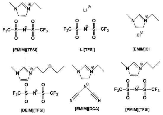 Generally, there are many kinds of ILs that can be used to modify PU by physical blending. For example, 1-ethyl-3-methylimidazolium bis(trifluoromethylsulfonyl)imide ([EMIM][TFSI]) [,] is usually applied to blend with PU. Its anionic group [TFSI]− can easily form hydrogen bond with the carbamate group of PU. This is because [TFSI]− contlyains strong electronegative elements such as N, O, and F. Jiang et al. [] prepared high transparent and flexible PU-based ionogels by mixing PU with ILs containing [TFSI]− as anions rather than [BF4]− or [PF6]−. This indicated that the compatibility of ILs with PU was dominated by the anion rather than the cation group. The hydrogen interaction between [TFSI]− and PU was confirmed by Fourier transform infrared spectroscopy. Jin et al. [] calculated the binding energy between IL and PU using density functional theory. The results showed that the average binding energy of [TFSI]− to different binding sites of hard and soft segments of PU was higher than [EMIM]+, which not only indicated that [EMIM][TFSI] existed in the hard and soft segments of PU, but also the interaction between anions and PU was greater than cations. Lee et al. [] fabricated cross-linked PU-based ionogels with response ability to temperature by synthesizing PU in the presence of ILs. They found that the ionogel could undergo reversible transparent–opaque transition by heating or cooling it. In addition to [EMIM][TFSI], commonly used ILs for mixing with PU also include Li[TFSI] [,], 1,2-dimethyl-3-ethoxyethyl-imidazolium bis(trifluoromethanesulfonyl)imide ([DEIM][TFSI]) [], [EMIM]Cl [], 1-ethyl-3-methylimidazolium dicyanamide ([EMIM][DCA]) [], and [PMIM][TFSI] []. The chemical structures of the applied ILs are shown in Figure 2.