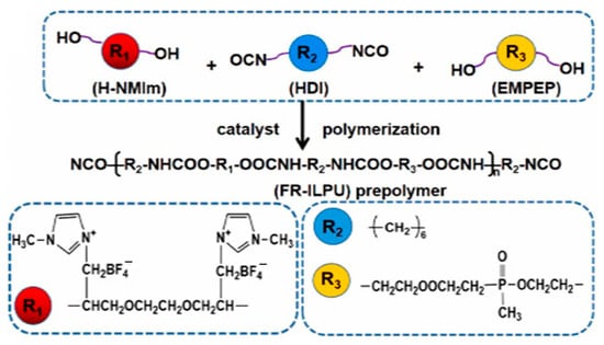 The schematic process of synthesizing flame-retardant ionic liquid polyurethane (FR-ILPU) []. “Reprinted/adapted with permission from Ref. []. 2023, Chen, J.; Rong, L.; Liu, X.; Liu, J.; Yang, X.; Jiang, X.” More details on “Copyright and Licensing” are available via the following link: https://doi.org/10.1016/j.polymer.2023.125759.