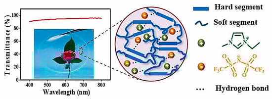 Transmittance of TPU@IL ionogel in the visible range (400–800 nm). The inset is a photo of TPU@IL ionogel, and the background of a flower can be seen clearly. The right image shows the schematic structure of the ionogel []. “Reprinted/adapted with permission from Ref. []. 2021, Jiang, N.; Chang, X.; Hu, D.; Chen, L.; Wang, Y.; Chen, J.; Zhu, Y.” More details on “Copyright and Licensing” are available via the following link: https://doi.org/10.1016/j.cej.2021.130418.