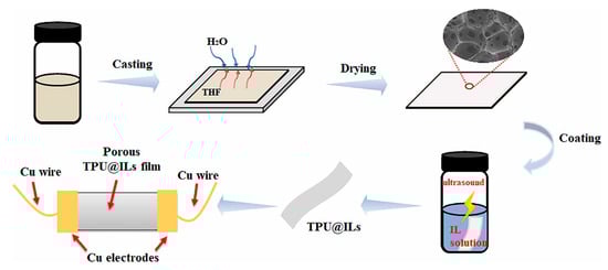 Schematic process of the fabrication of hierarchically porous TPU@ILs ionogel film and the assembly of flexible sensor based on the film []. “Reprinted/adapted with permission from Ref. []. 2022, Peng, M.; Li, X.; Liu, Y.; Chen, J.; Chang, X.; Zhu, Y.” More details on “Copyright and Licensing” are available via the following link: https://doi.org/10.1016/j.apsusc.2022.155516.