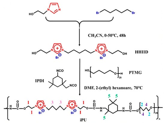 Synthesis process of ionic PU (i-PU) by IPDI, PTMG, and ionic chain extender, HHIID []. “Reprinted/adapted with permission from Ref. []. 2022, Han, S.; Zhang, R.; Han, L.; Zhao, C.; Yan, X.; Dai, M.” More details on “Copyright and Licensing” are available via the following link: https://doi.org/10.1016/j.eurpolymj.2022.111292.
