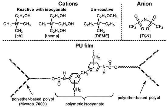 Structure of [Tf2N]-type ILs containing [ch] or [thema] as reactive cations and N, N-diethyl-N-methyl-N-(2-methoxyethyl)ammonium as an un-reactive cation, and the common structure of the PU films synthesized by the reaction of polymeric isocyanate and polyether-based polyol []. “Reprinted/adapted with permission from Ref. []. 2014, Iwata, T.; Tsurumaki, A.; Tajima, S.; Ohno, H.” More details on “Copyright and Licensing” are available via the following link: https://doi.org/10.1016/j.polymer.2014.03.028.