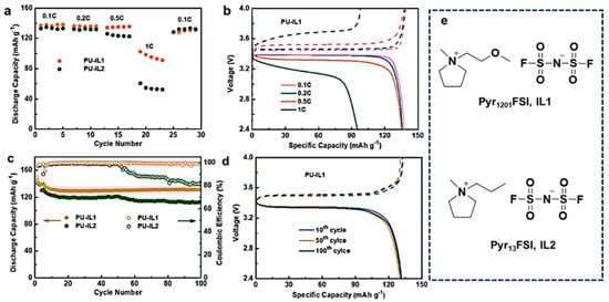 Performance of LiFePO4/Li batteries with PU-IL1 and PU-IL2 electrolytes at 80 °C: (a) rate performance of the batteries from 0.1 to 1 C; (b) charge–discharge profiles of the battery with PU-IL1 electrolyte at different current densities. Charge is represented by a dotted line and discharge is represented by a solid line); (c) cycling performance of the batteries at 0.5C; (d) charge–discharge curves at the 10th, 50th, and 100th cycles. Charge is represented by a dotted line and discharge is represented by a solid line) (e) the structure diagram of Pyr1201FSI (IL1) and Pyr13FSI (IL2) []. “Reprinted/adapted with permission from Ref. []. 2022, Fang, L.; Sun, W.; Hou, W.; Wang, Z.; Sun, K.” More details on “Copyright and Licensing” are available via the following link: https://doi.org/10.1016/j.electacta.2022.141316.