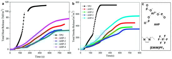 PU is easy to burn when exposed to fire and will release a large number of NO, CO, and other toxic gases [,]; therefore, improving the flame-retardant performance of PU is of great significance. Pyrrolinium-based IL has been reported to be used as a flame retardant in lithium-ion battery electrolytes []. It has been found that ionic PU has better flame-retardant performance and smoke-suppression properties []. Imidazolium-based IL ([EMIM]PF6) can be used as a catalyst and auxiliary flame retardant, and aluminum hypophosphite (AHP) was used as the main flame retardant in PU by a melting blending method. As shown in Figure 10a, the total heat release values and the slope of the curves significantly decrease with the addition of AHP and [Emim]PF6, indicating that there is an obvious improvement in flame retardancy in the TPU composites. In Figure 10b, the total smoke release curves of flame-retardant TPU composites are much lower than those of TPU. This implies that the IL can catalyze the decomposition of AHP to form a protective carbon layer, reduce the smoke emission parameters, improve the flame-retardant effect, and further enhance the thermal stability of TPU/AHP systems [].